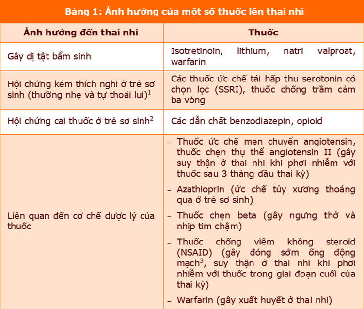 Thuốc có thể ảnh hưởng đến thai nhi đang phát triển theo nhiều cách khác nhau. Một số thuốc tác động vào quá trình phát triển của thai nhi và có thể gây dị tật bẩm sinh (dạng cấu trúc) khi được dùng trong thời kỳ mang thai. Những thuốc này cũng có thể làm tăng nguy cơ xảy ra các biến chứng sản khoa như sảy thai, sinh non và thai chết lưu. Việc người mẹ sử dụng một số thuốc như thuốc chống động kinh (ví dụ: natri valproat) có liên quan đến các rối loạn phát triển thần kinh ở trẻ nhỏ (ví dụ: tự kỷ, chậm phát triển trí tuệ). Các tác dụng không mong muốn khác đối với thai nhi có thể liên quan đến việc sử dụng thuốc trong thai kỳ được trình bày trong Bảng 1.
