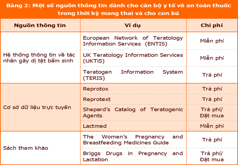Tại Úc và trên thế giới, có nhiều nguồn thông tin về an toàn của thuốc trong thời kỳ mang thai và cho con bú cho cán bộ y tế (Bảng 2).