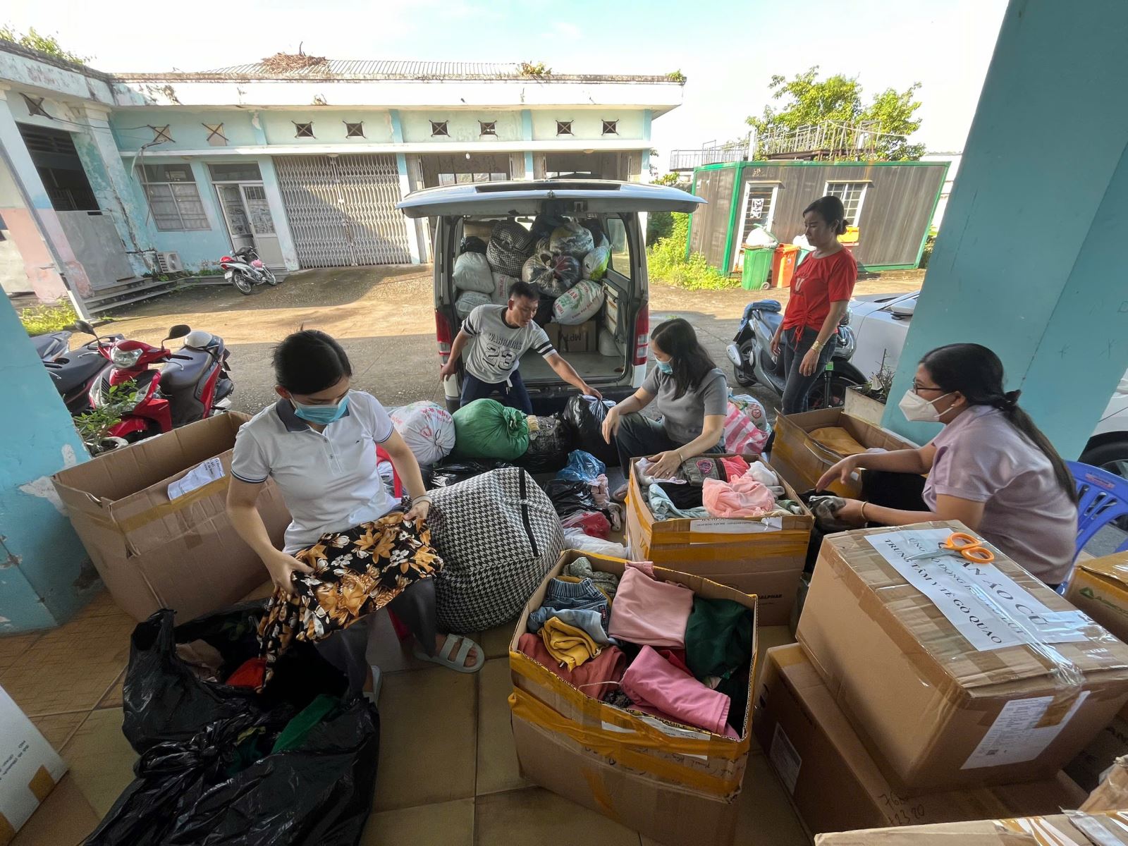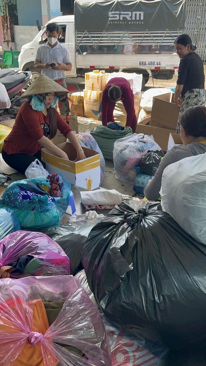Ảnh: Vừa tiếp nhận hàng viện trợ vừa đóng gói đưa lên xe