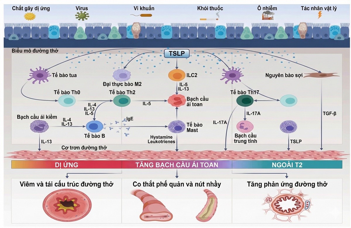 Trong số các cytokin viêm, thymic stromal lymphopoietin (TSLP) trong những năm gần đẩy nổi lên như một nhân tố then chốt, đóng vai trò khởi phát và khuếch đại phản ứng viêm trong hen nặng. TSLP thúc đẩy hoạt hóa tế bào tua gai, cảm ứng biệt hóa Th2, đồng thời kích thích ILC2, dưỡng bào, bạch cầu ái toan và bạch cầu ưa bazơ tiết các cytokine typ 2 [6]. Đáng chú ý, TSLP không chỉ liên quan đến hen typ 2 mà còn góp phần vào tăng đáp ứng phế quản và tái cấu trúc đường thở trong hen không typ 2 [6].